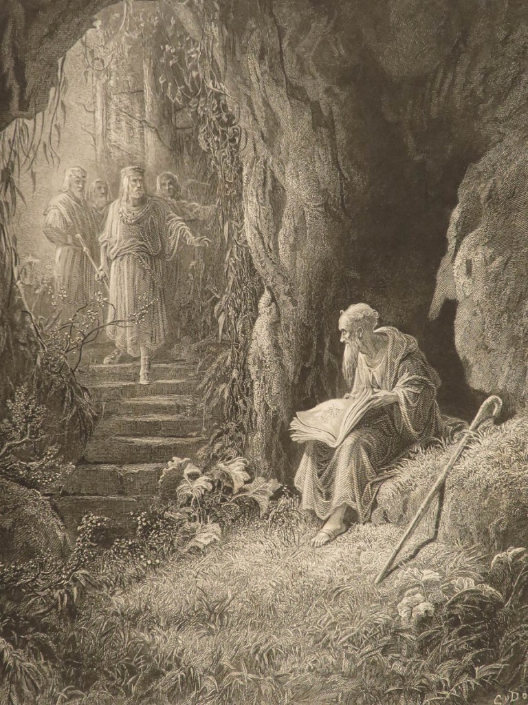 Gustave Doré (1832-1883); Roi Arthur, Ermite dans la grotte, ilustração para Idylls of the King, de Alfred Lord Tennyson, 1889.