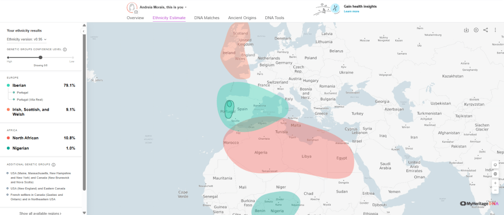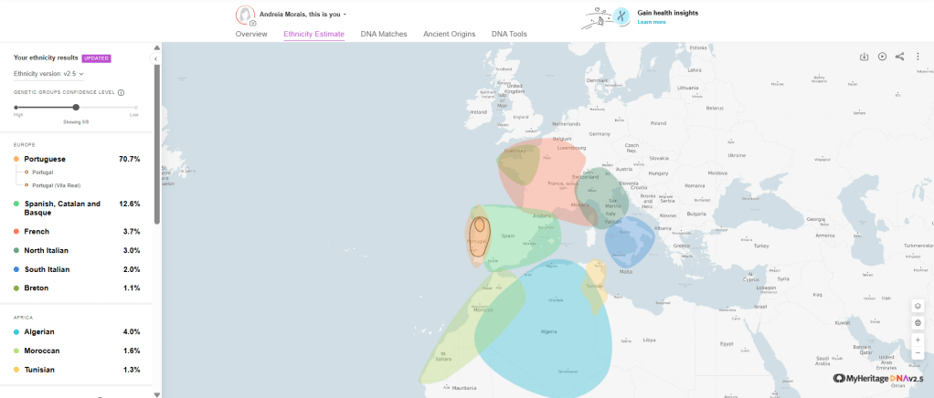Infelizmente, quem não tiver acesso à versão anterior, pode não ficar elucidado nem sequer desconfiar que tem aquelas ancestralidades, o que é lamentável e evidencia a necessidade de fundamentação histórica e genealógica. Procuremos conhecer e honrar as vidas e provações daqueles que estiveram por detrás destas percentagens espalhadas num mapa! Como é evidente, se me baseasse apenas na primeira versão, eu não teria evidência genética das minhas ancestralidades italianas e francesas. No entanto, eu tinha todas as provas genealógicas desse facto e, para que não restassem dúvidas, os resultados dos testes dos meus ascendentes diretos sempre corroboraram isso, de forma inequívoca. Para minha felicidade, a versão 2.5 revelou que também herdei a genética dessas etnicidades, entre outras.