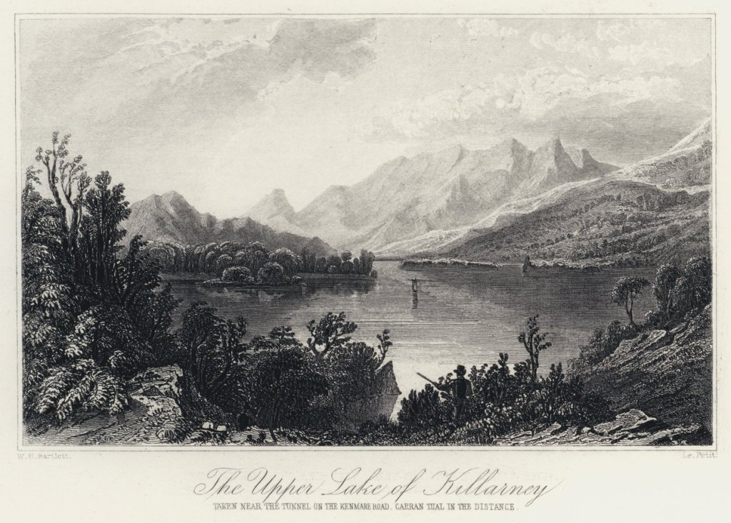 William Henry Bartlett (1809-1854); The Upper Lake of Killarney, taken near the Tunnel on the Kenmare road, Carran Tual in the distance, gravura.
